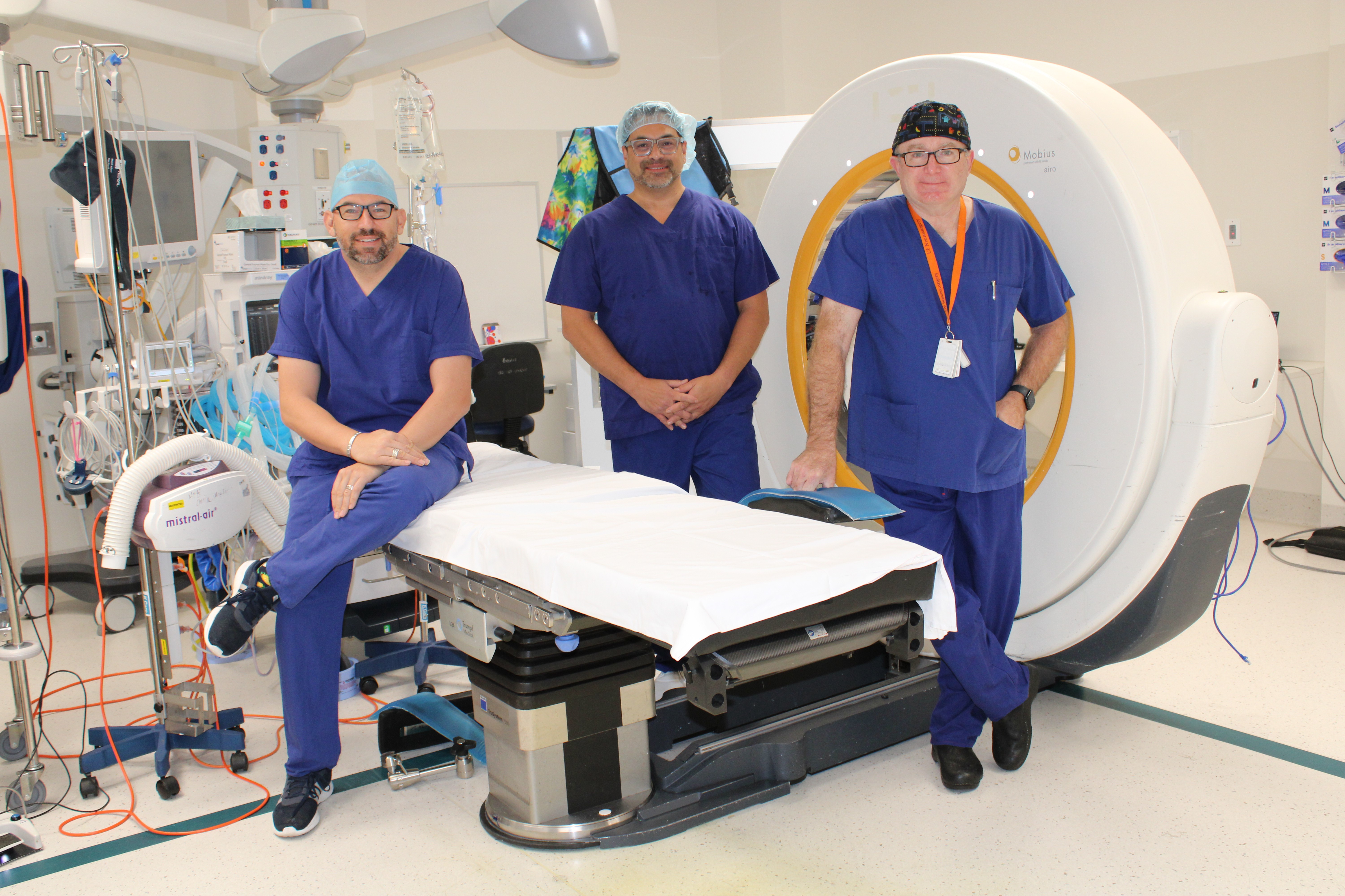 Anaesthetist Simon Zidar, Neurologist Julian Rodrigues and Neurosurgeon Stephen Lewis before the first procedure in WA where directional DBS electrodes capable of recording brain activity were surgically implanted into a patient.