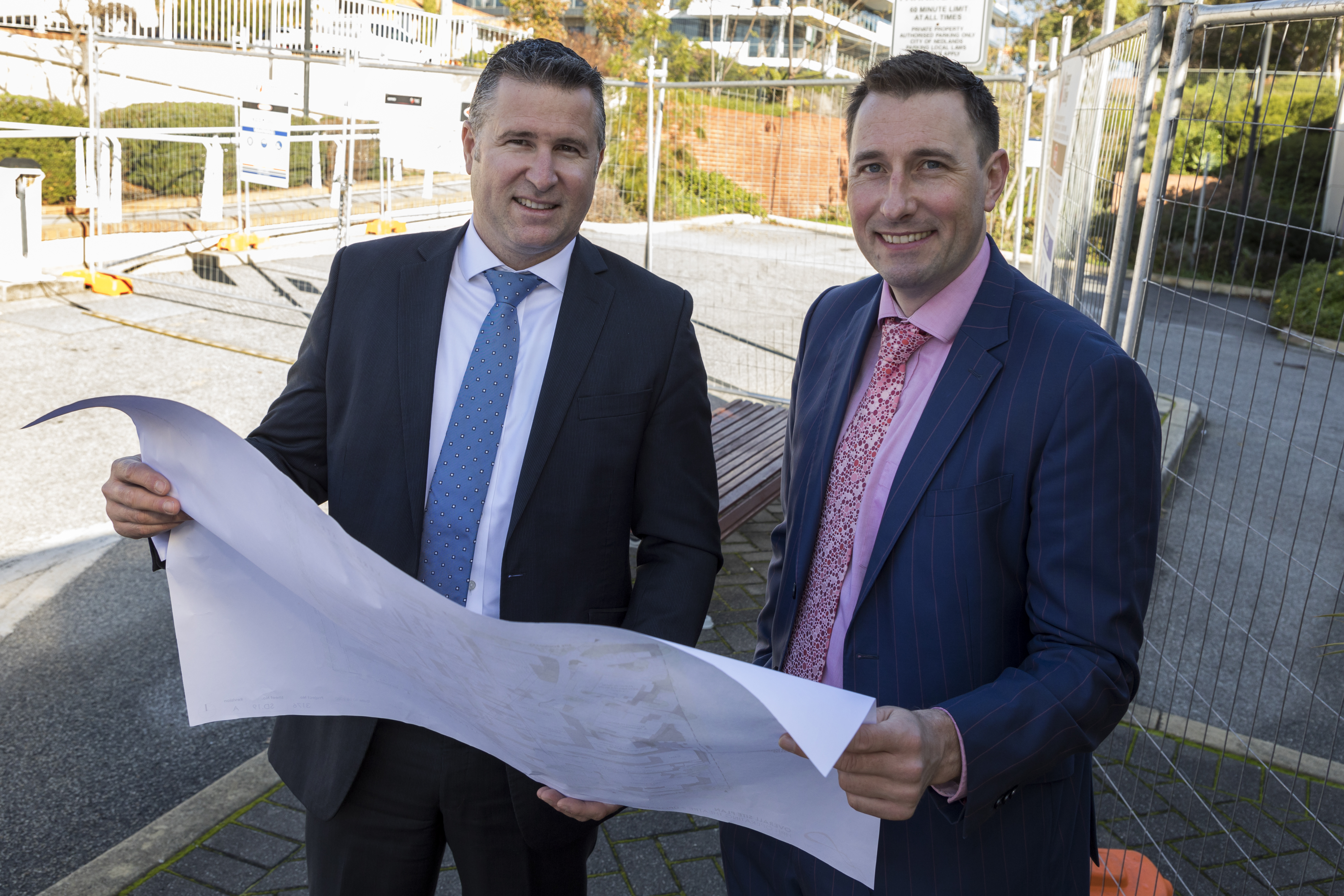 Hollywood Private Hospital Chief Executive Officer Andrew Tome and Director of Medical Services John Maxwell outside the building site of the new Angiography Suite.